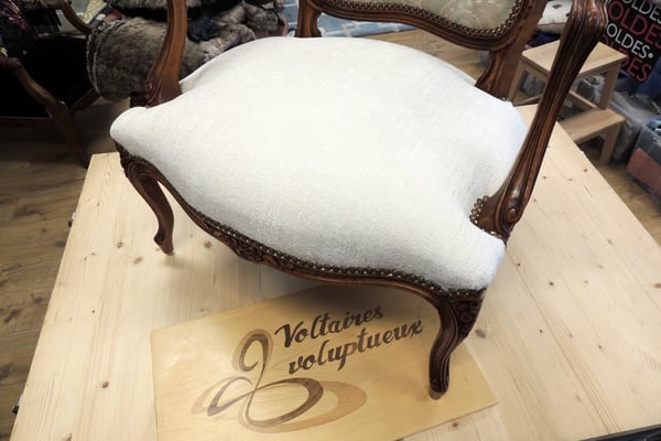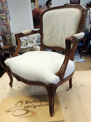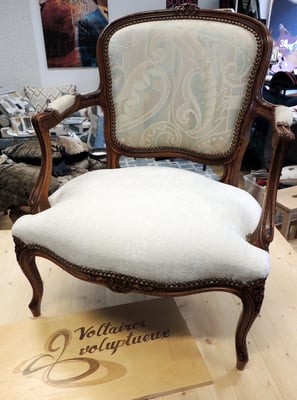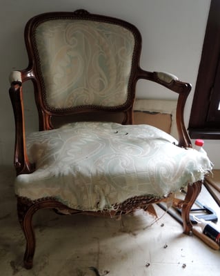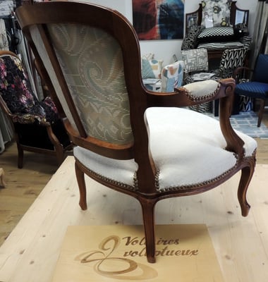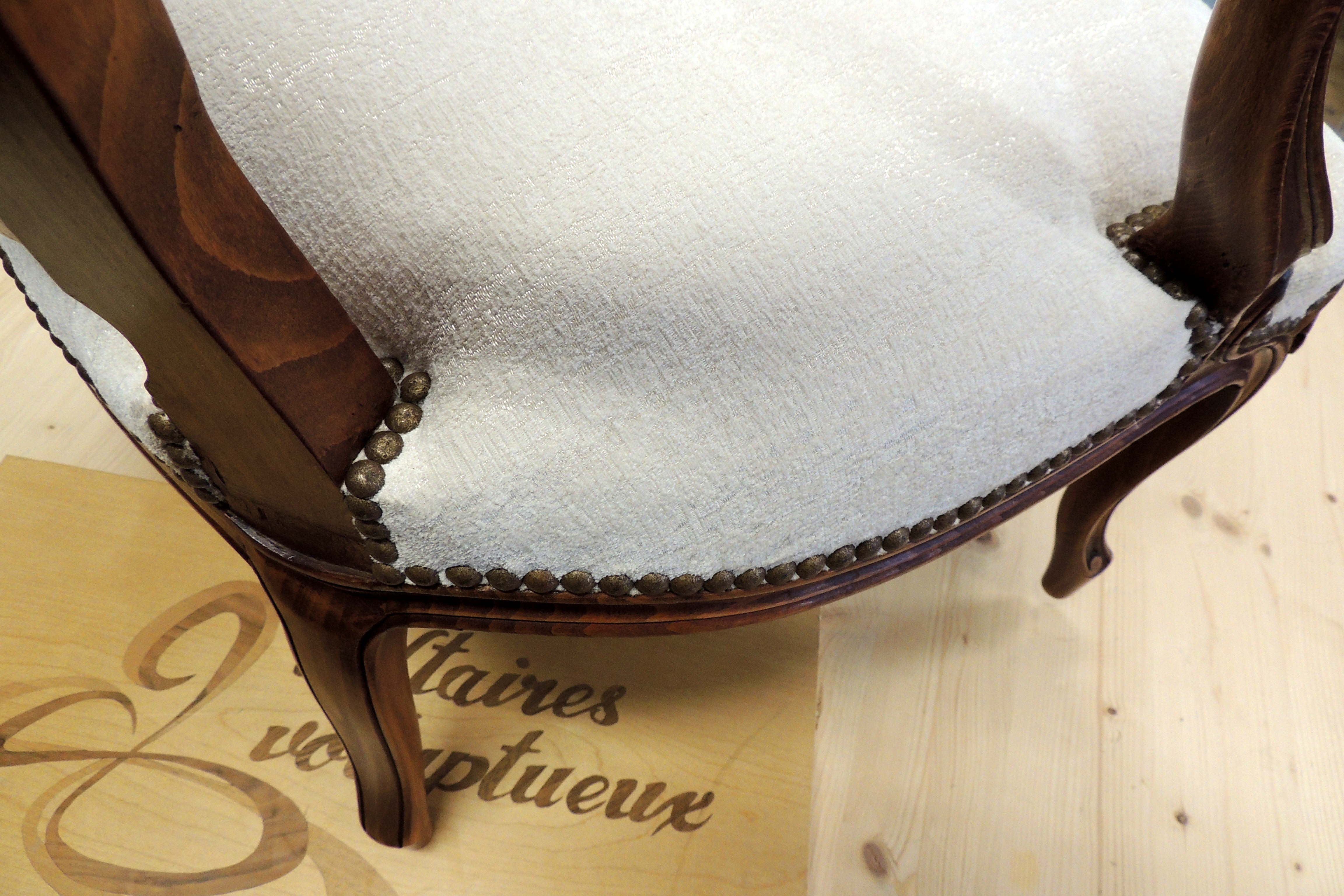 Notre clients ayant un ensembles chez lui réalisé avec le même tissu nous avons trouver une solution pour lui afin de garder l’harmonie, en ne changent que le tissu de l'assise avec un tissu coordonné, donner un style plus moderne. Tout en conservant le tissu d'origine sur le dossier.