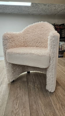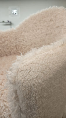 Le secret de ce look irrésistible ? Un mix audacieux de deux textures d'exception : L'assise et le dossier s'habillent de la fausse fourrure FLUFFY de chez Fine, pour un toucher ultra-moelleux. Les extérieurs et détails sont sublimés par le tissu TEXEL effet peau de mouton de chez Casal, apportant cette touche authentique et chaleureuse. 🐑