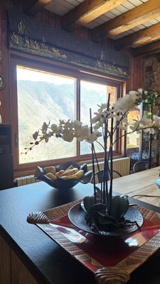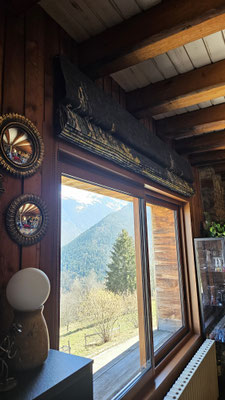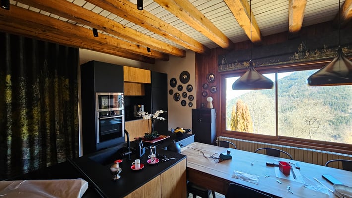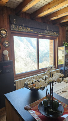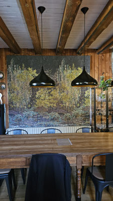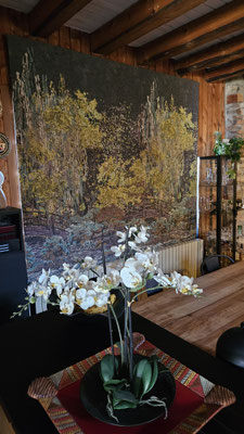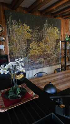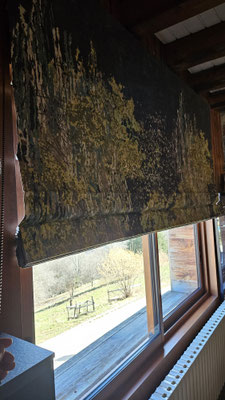 Quand la fenêtre se transforme en véritable tableau... Pour ce projet, nous avons réalisé un store bateau d'exception en utilisant le tissu Cosmic Garden de la maison JAB. Son motif panoramique aux détails forestiers crée une immersion totale et apporte une profondeur unique à la pièce.