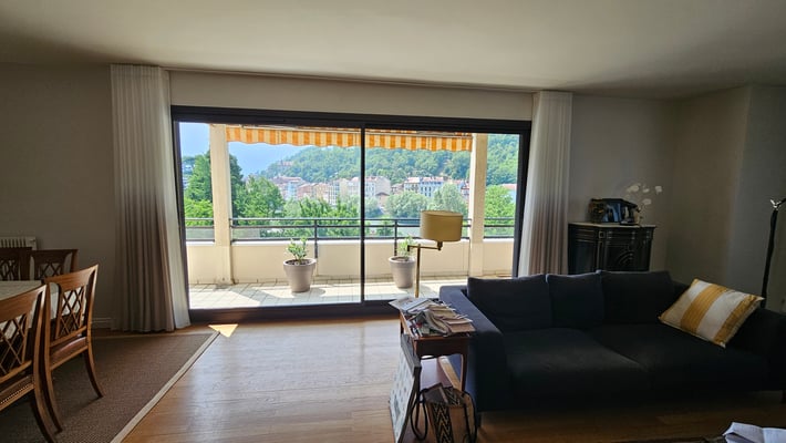 Pour ce salon, nous avons misé sur la légèreté et la modernité avec la création d'un ensemble de voilages sur mesure. Toute la particularité de cette réalisation réside dans le choix du tissu KISOS de chez Camengo. 🕊️
