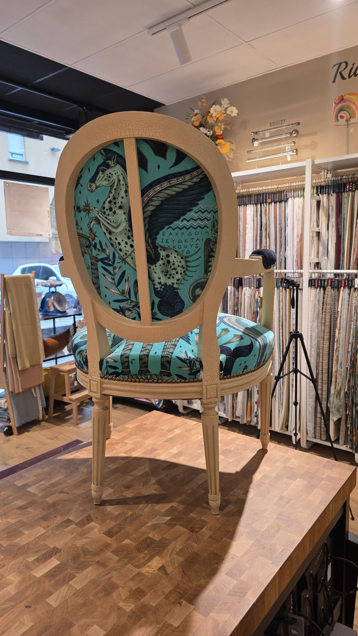 L'atelier Voltaires Voluptueux à Domène sublime un fauteuil cabriolet classique en une pièce d'exception grâce à l'univers fantastique et vibrant du tissu Emma J Shipley.