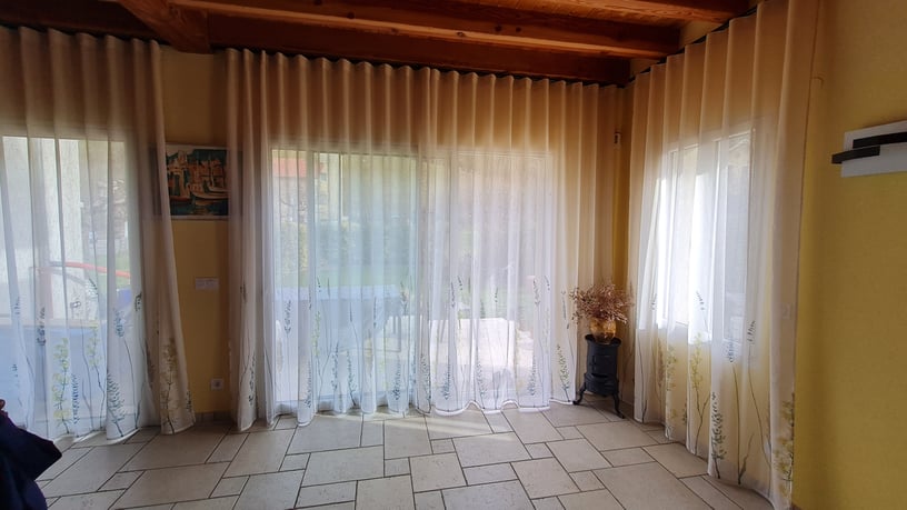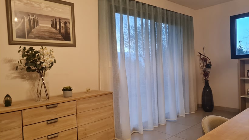 Pour ce projet d'aménagement, nous avons habillé les ouvertures de notre cliente avec la finesse des collections Camengo. Le choix s'est porté sur un voilage brodé qui laisse filtrer une lumière douce tout en préservant l'intimité de la pièce. 🕊️