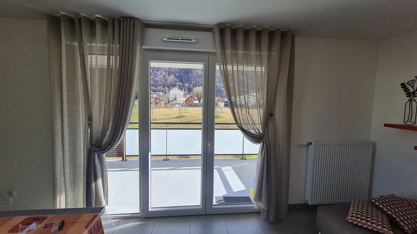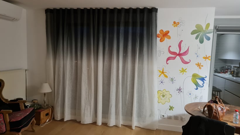 Chaque intérieur a ses particularités techniques, et notre métier est d'y répondre avec esthétique. Pour ce projet, nous avons installé un rail coudé épousant parfaitement l’angle de la pièce, permettant une circulation fluide et continue du textile.