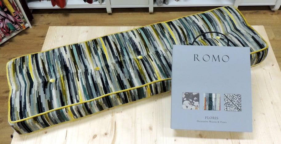 Tissu de chez Romo. Coussin mousse finition passepoil et bouton.